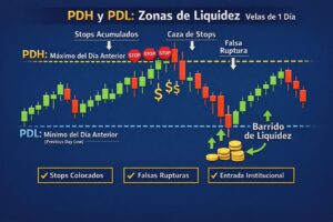 - Búsqueda de Liquidez: Los traders observan cómo el precio interactúa con PDH/PDL. A menudo, el precio «manipula» (supera brevemente y luego revierte) estos niveles para buscar liquidez antes de moverse en una dirección.